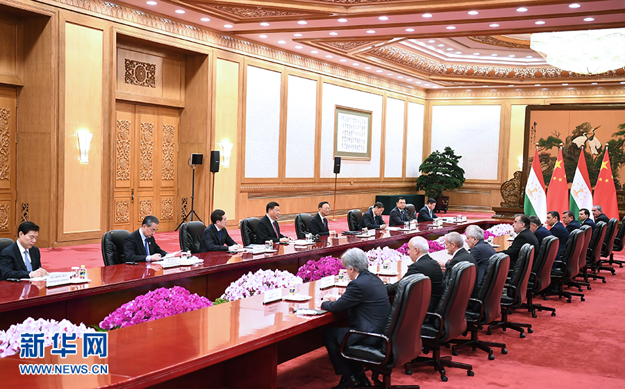4月28日,國(guó)家主席習(xí)近平在北京人民大會(huì)堂會(huì)見(jiàn)塔吉克斯坦總統(tǒng)拉赫蒙。 新華社記者 謝環(huán)馳 攝