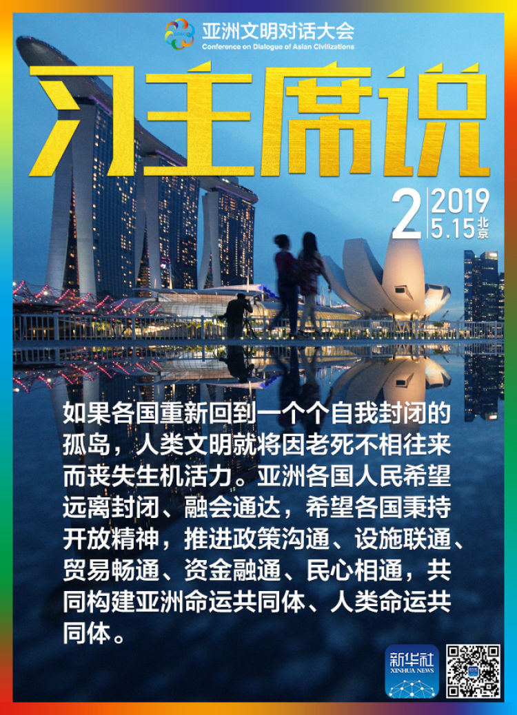 如果各國重新回到一個個自我封閉的孤島,人類文明就將因老死不相往來而喪失生機(jī)活力。亞洲各國人民希望遠(yuǎn)離封閉、融會通達(dá),希望各國秉持開放精神,推進(jìn)政策溝通、設(shè)施聯(lián)通、貿(mào)易暢通、資金融通、民心相通,共同構(gòu)建亞洲命運共同體、人類命運共同體。