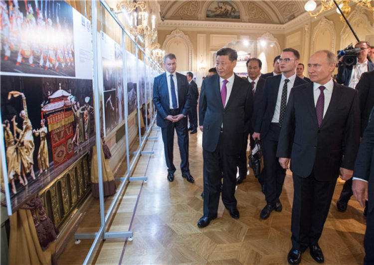 ↑6月5日,國(guó)家主席習(xí)近平和俄羅斯總統(tǒng)普京在莫斯科大劇院共同出席中俄建交70周年紀(jì)念活動(dòng)。這是兩國(guó)元首共同參觀中俄建交70周年圖片展。新華社記者 李學(xué)仁 攝