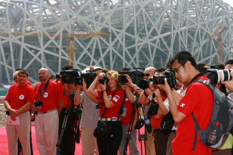 ↑參加“中俄友誼之旅·中國(guó)行”報(bào)道組的中俄兩國(guó)媒體記者在北京奧體中心采訪。(2007年6月25日,李明放)