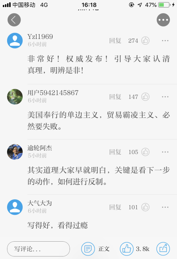 文章刊發(fā)后,網(wǎng)友紛紛轉(zhuǎn)發(fā)、點(diǎn)贊,表示“全面、清晰且深刻?!薄皺?quán)威發(fā)布!引導(dǎo)大家認(rèn)清真理,明辨是非!”“美國奉行的單邊主義,貿(mào)易霸凌主義、必然要失敗。 ”