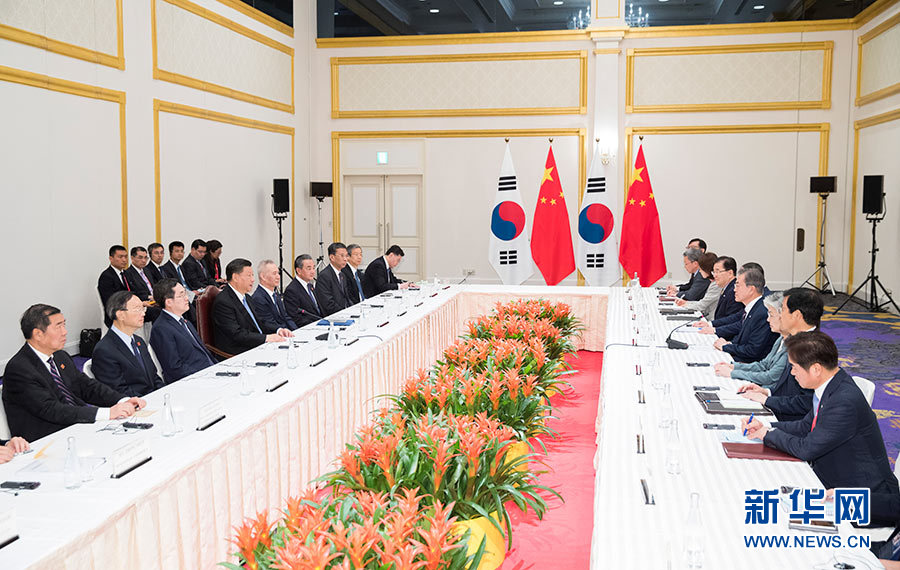習近平指出,加強中韓友好合作符合歷史潮流,也是兩國人心所向。中方愿同韓方堅持以誠相待,努力實現(xiàn)合作共贏,推動兩國關(guān)系不斷向前發(fā)展,并為朝鮮半島和地區(qū)和平穩(wěn)定作出貢獻。雙方要保持各層次溝通,把穩(wěn)雙邊關(guān)系發(fā)展大方向。要把握共建“一帶一路”機遇,加快中韓自由貿(mào)易協(xié)定第二階段談判,不斷擴大貿(mào)易、科技、財經(jīng)、環(huán)保等領(lǐng)域合作。要積極開展人文交流,鞏固中韓民間友好。中韓合作完全是互利雙贏的,不應該受到外部壓力影響。希望韓方繼續(xù)重視、妥善處理好兩國間有關(guān)問題。雙方要加強在聯(lián)合國、二十國集團等多邊框架內(nèi)的協(xié)調(diào),共同反對保護主義,支持多邊主義和自由貿(mào)易體制,推動構(gòu)建開放型世界經(jīng)濟。