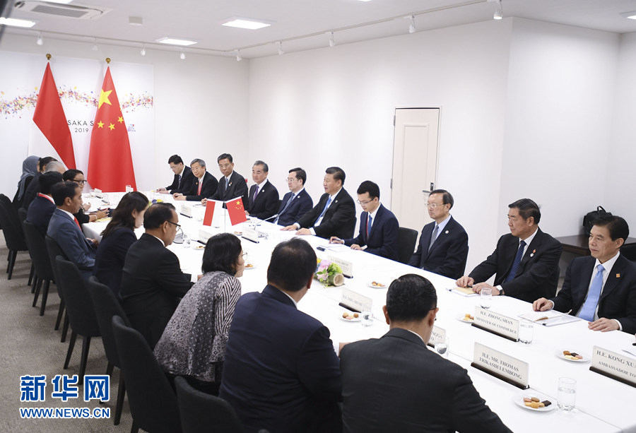 6月28日,國家主席習近平在大阪會見印度尼西亞總統(tǒng)佐科。 新華社記者 燕雁 攝