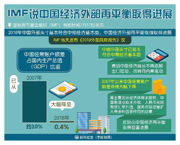 IMF當(dāng)天發(fā)布《2019外部風(fēng)險報告》說,中國經(jīng)常賬戶順差占國內(nèi)生產(chǎn)總值(GDP)比重已從2007年的約10%大幅降至2018年的0.4%,中國外部頭寸已基本符合中期經(jīng)濟基本面,表明中國經(jīng)濟增長不再依賴出口拉動,而轉(zhuǎn)向內(nèi)需驅(qū)動。