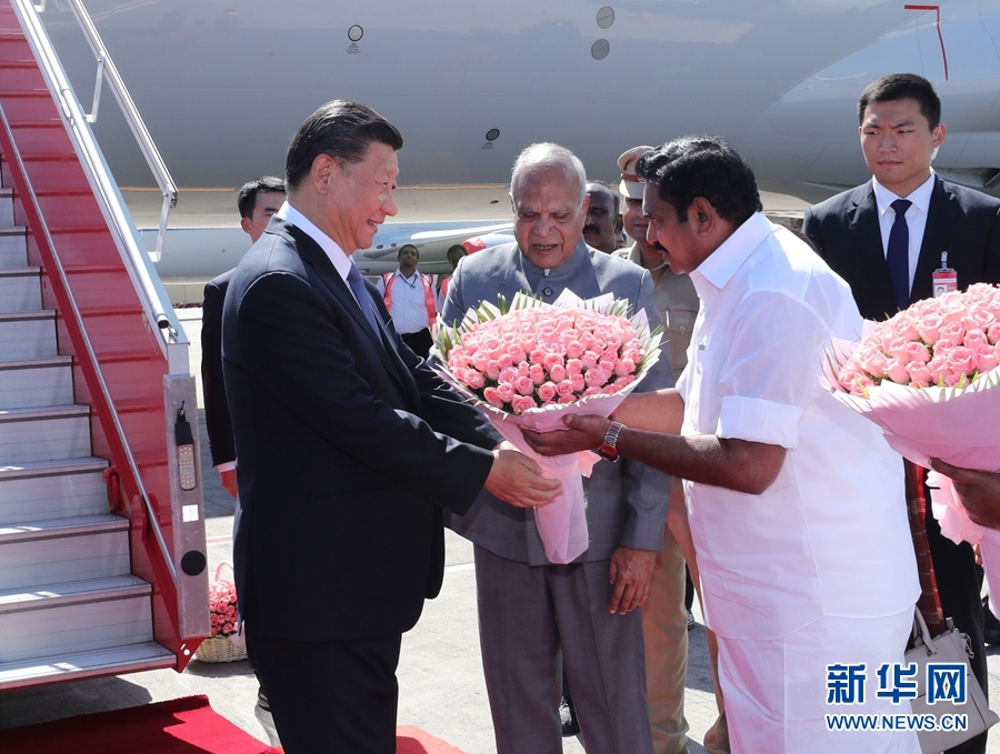 10月11日,國家主席習(xí)近平乘專機抵達金奈,應(yīng)印度共和國總理莫迪邀請,出席中印領(lǐng)導(dǎo)人第二次非正式會晤。印度泰米爾納德邦邦長普羅希特、首席部長帕拉尼斯瓦米等在舷梯旁迎接,向習(xí)近平敬獻鮮花。 新華社記者 鞠鵬 攝
