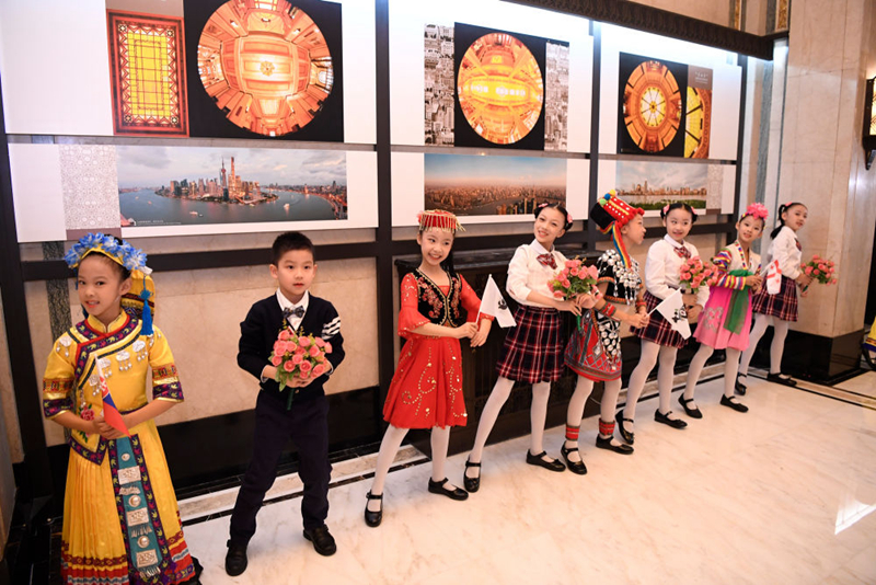 身著各民族服裝的少年兒童載歌載舞,迎接嘉賓到來——