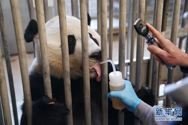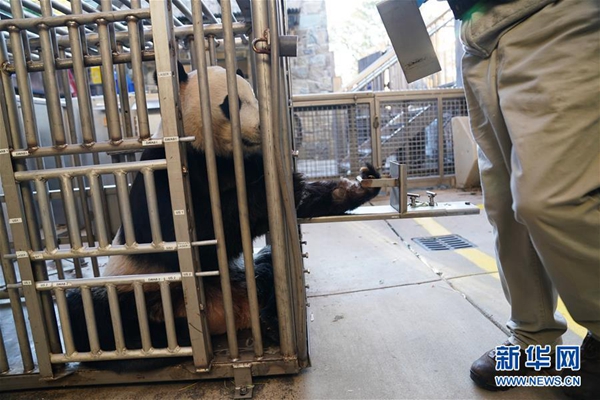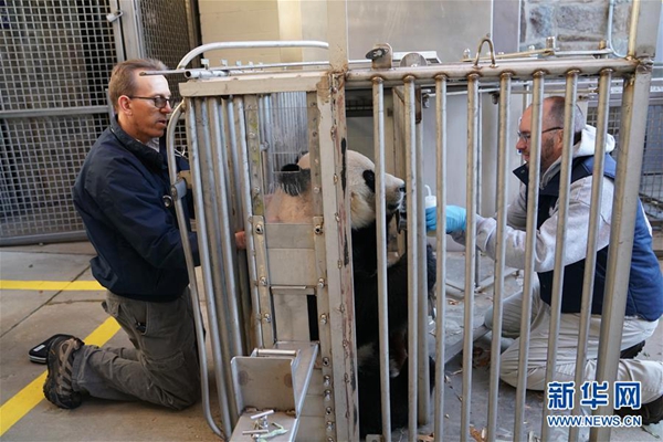 11月13日,在美國(guó)華盛頓的美國(guó)國(guó)家動(dòng)物園,工作人員在為大熊貓“貝貝”體檢。新華社記者 劉杰 攝