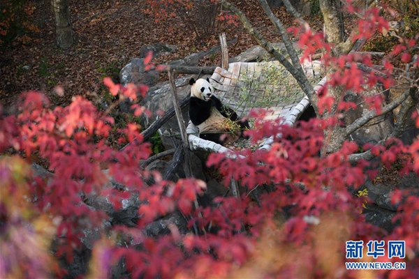 11月13日,在美國(guó)華盛頓的美國(guó)國(guó)家動(dòng)物園,大熊貓“貝貝”接受體檢后到室外活動(dòng)。新華社記者 劉杰 攝