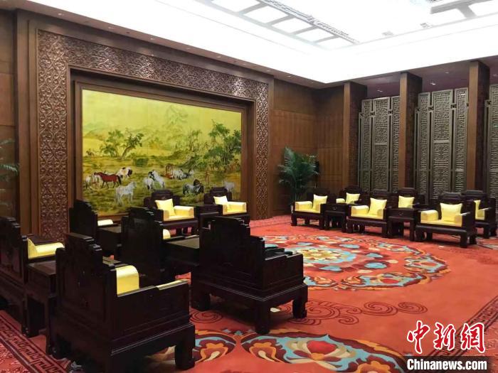 陳玉樹介紹,《松風》的創(chuàng)作靈感源自宮廷舊藏——乾隆時期紫檀嵌玉寶座。作品采用世界名貴木材和純手工雕刻工藝,其椅面寬大,直靠背,搭腦后延似卷書狀,上雕蝙蝠銅錢周邊輔以拐子龍圖樣,寓意“福壽雙全”。扶手兩側(cè)均刻以松枝寓長青不老、堅韌忠貞之意??勘嘲逡愿叱摹敖z翎檀雕”工藝雕以“松鶴延年圖”。后背板更雕以“五福捧壽”圖樣,前后呼應,福壽雙至。座面下打洼束腰,拐子紋飾直牙條,方腿直下,半部略呈鼓腿后順沿而下外翻祥云紋馬蹄足。整套造型體量寬大,紋飾繁復,具有典型的清式家具特色。