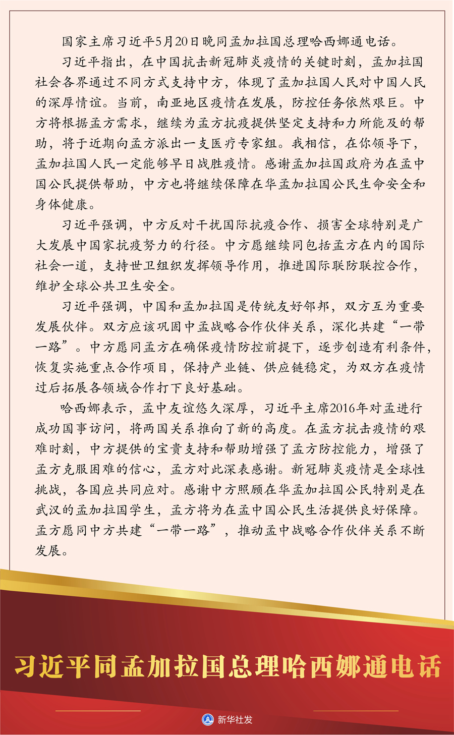 習(xí)近平指出,在中國抗擊新冠肺炎疫情的關(guān)鍵時刻,孟加拉國社會各界通過不同方式支持中方,體現(xiàn)了孟加拉國人民對中國人民的深厚情誼。當前,南亞地區(qū)疫情在發(fā)展,防控任務(wù)依然艱巨。中方將根據(jù)孟方需求,繼續(xù)為孟方抗疫提供堅定支持和力所能及的幫助,將于近期向孟方派出一支醫(yī)療專家組。我相信,在你領(lǐng)導(dǎo)下,孟加拉國人民一定能夠早日戰(zhàn)勝疫情。感謝孟加拉國政府為在孟中國公民提供幫助,中方也將繼續(xù)保障在華孟加拉國公民生命安全和身體健康。