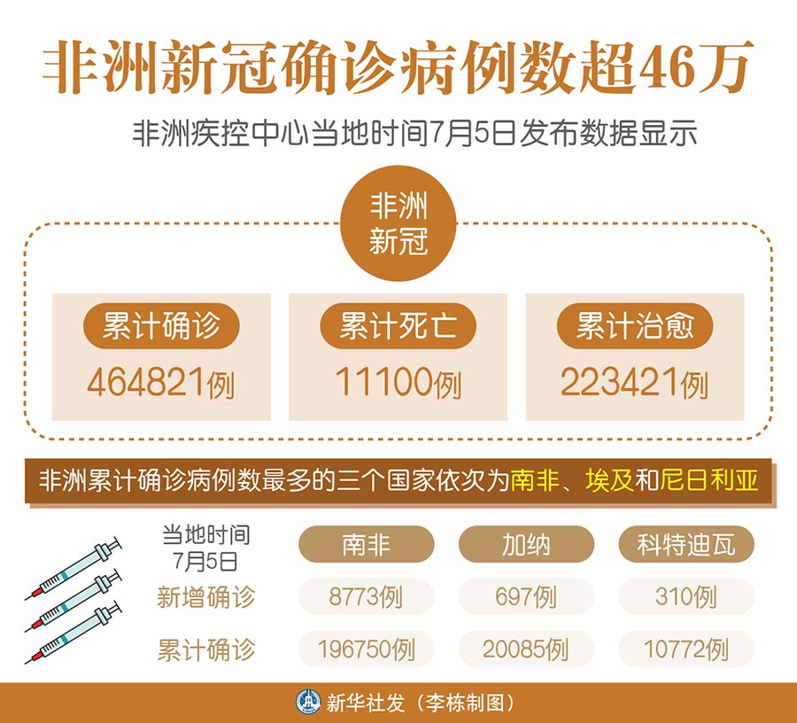 新華社阿比讓7月5日電 綜合新華社駐非洲地區(qū)記者報(bào)道:非洲疾控中心5日發(fā)布數(shù)據(jù)顯示,非洲累計(jì)新冠確診病例達(dá)464821例,累計(jì)死亡11100例,累計(jì)治愈223421例。