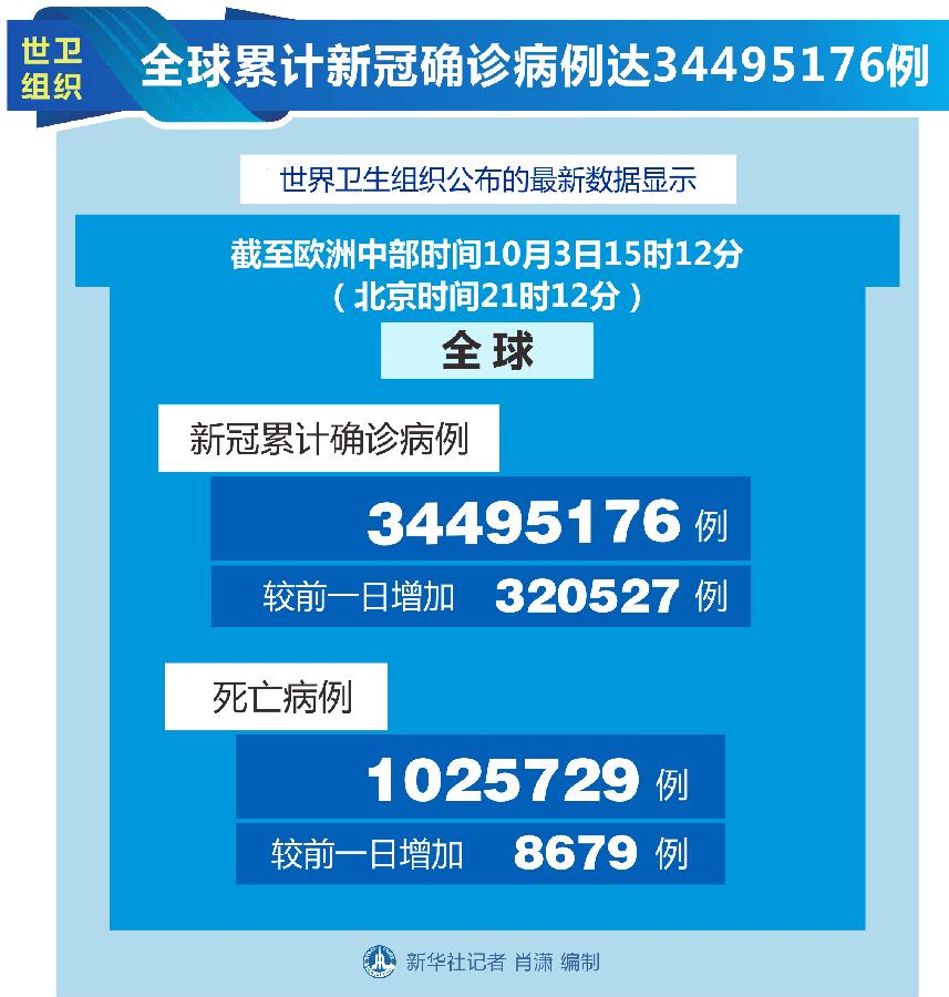 世衛(wèi)組織網站最新數據顯示,截至歐洲中部時間3日15時12分(北京時間21時12分),全球確診病例較前一日增加320527例,達到34495176例;死亡病例增加8679例,達到1025729例。
