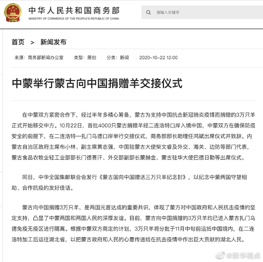 10月22日,首批4000只蒙古國(guó)捐贈(zèng)羊經(jīng)二連浩特口岸入境中國(guó),中蒙雙方在確保防疫安全的前提下,在二連浩特—扎門烏德口岸舉行交接儀式。詳情?? ????