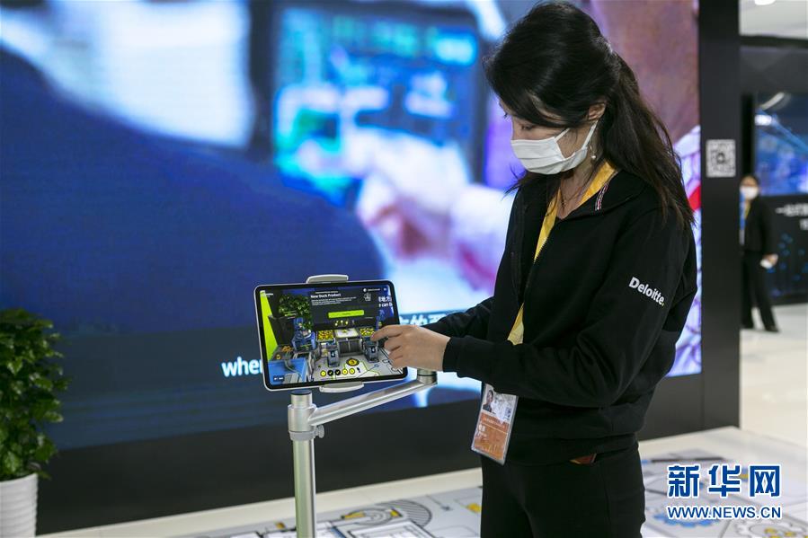 11月5日,在第三屆進博會服務貿(mào)易展區(qū),德勤公司在中國首發(fā)“德勤小黃鴨智能工廠”,工作人員通過AR(增強現(xiàn)實)技術(shù)展示智能工廠的應用場景。 新華社記者 王翔 攝
