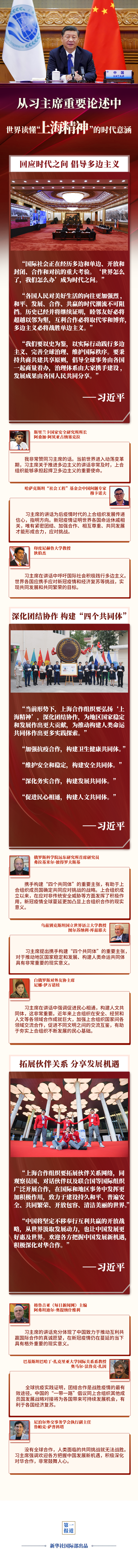 習(xí)主席的講話引發(fā)國(guó)際社會(huì)積極反響。多國(guó)專家學(xué)者表示,習(xí)主席的重要論述為上合組織的發(fā)展指明方向,豐富“上海精神”的時(shí)代意涵,為推動(dòng)構(gòu)建更加緊密的命運(yùn)共同體注入強(qiáng)大動(dòng)力——