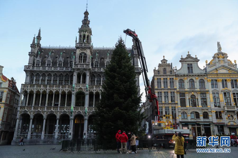 這是11月19日在比利時(shí)布魯塞爾大廣場拍攝的圣誕樹安裝現(xiàn)場。