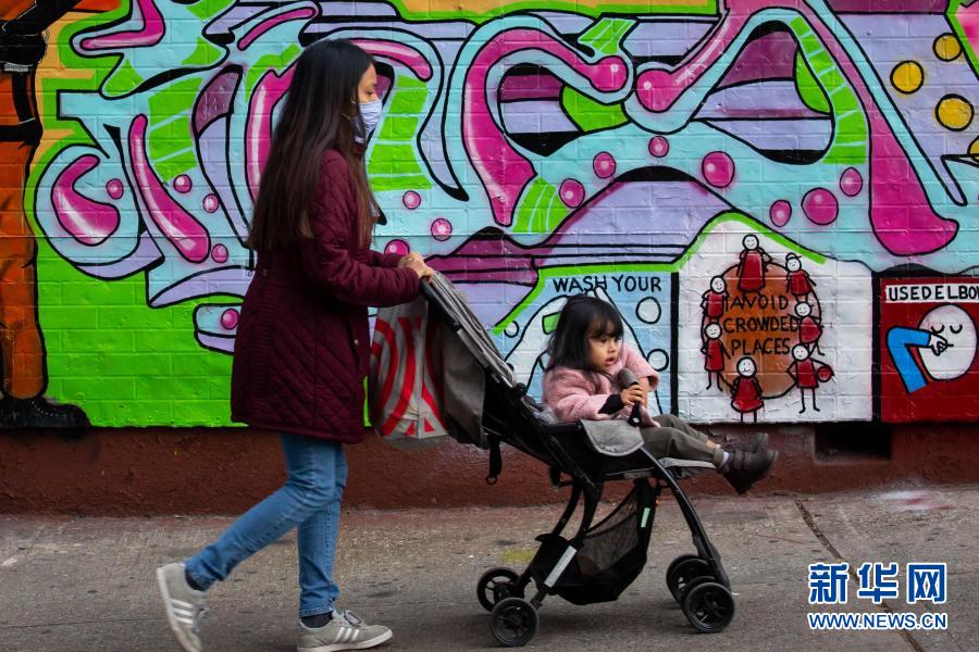 11月21日,在美國紐約,一名女子推著孩子經(jīng)過抗疫宣傳壁畫。美國約翰斯·霍普金斯大學(xué)21日發(fā)布的新冠疫情最新統(tǒng)計(jì)數(shù)據(jù)顯示,美國累計(jì)確診病例超過1200萬例。新華社發(fā)(郭克攝)
