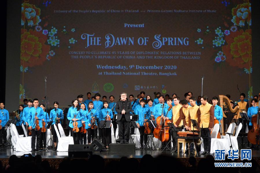 慶祝中泰建交45周年音樂會“春曉”9日晚在曼谷國家大劇院成功上演。這場融合了中國、泰國和西方音樂元素的音樂會由中國駐泰使館和泰國干拉耶尼音樂學院主辦,泰國文化部和中國南京藝術學院給予支持。