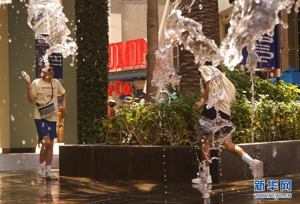 6月16日,美國(guó)加利福尼亞州洛杉磯市民在噴泉旁戲水納涼。加州南部本周迎來(lái)今年的首次高溫天氣。