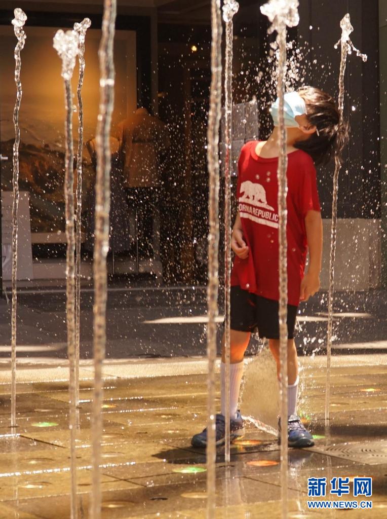6月16日,美國(guó)加利福尼亞州洛杉磯市民在噴泉中戲水納涼。加州南部本周迎來今年的首次高溫天氣。