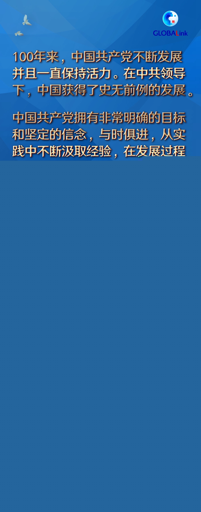 阿馬爾對中國共產(chǎn)黨成立100周年表示熱烈祝賀。他說,中國共產(chǎn)黨擁有非常明確的目標和堅定的信念,與時俱進,從實踐中不斷汲取經(jīng)驗,在發(fā)展過程中以人為本,這些都是中共能夠不斷發(fā)展并且一直保持活力的重要原因。